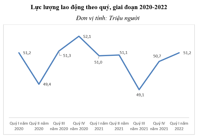 Cụ thể, lực lượng lao động từ 15 tuổi trở lên của cả nước trong quý I/2022 là 51,2 triệu người, tăng hơn 441.000 người so với quý trước và tăng gần 160.000 người so với cùng kỳ năm 2021. Tỉ lệ tham gia lực lượng lao động quý I/2022 là 68,1%. So với quý trước, lực lượng lao động ở cả gia khu vực nông thôn và thành thị đều tăng khoảng 200.000 người. Lao động có việc làm ghi nhận mức tăng ở cả khối doanh nghiệp và cơ sở kinh doanh cá thể.