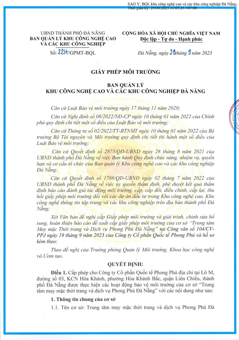 Tháng 9/2023, Công ty Cổ phần Quốc tế Phong Phú, chủ đầu tư của Dự án “Trung tâm May mặc Thời trang và Dịch vụ Phong Phú Đà Nẵng” (tại Lô M, đường số 03, KCN Hòa Khánh, phường Hòa Khánh Bắc, quận Liên Chiểu, thành phố Đà Nẵng) đã được Ban quản lý Khu công nghệ cao và các Khu công nghiệp Đà Nẵng cấp Giấy phép môi trường (GPMT) số 2237/GPMT-BQL ngày 29/09/2023.