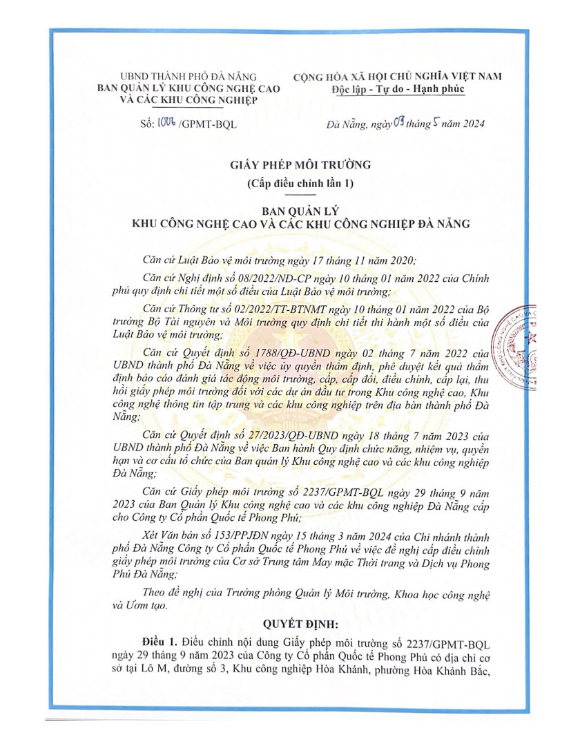 Tháng 05/2024, Công ty Cổ phần Quốc tế Phong Phú, chủ đầu tư của Dự án “Trung tâm May mặc Thời trang và Dịch vụ Phong Phú Đà Nẵng” (tại Lô M, đường số 03, KCN Hòa Khánh, phường Hòa Khánh Bắc, quận Liên Chiểu, thành phố Đà Nẵng) đã được Ban quản lý Khu công nghệ cao và các Khu công nghiệp Đà Nẵng cấp Giấy phép môi trường (GPMT) số 1006/GPMT-BQL ngày 09/05/2024.