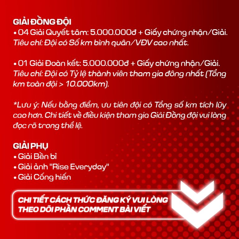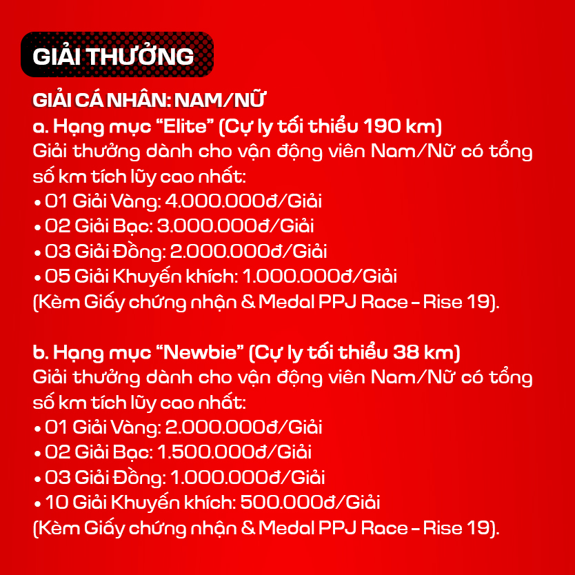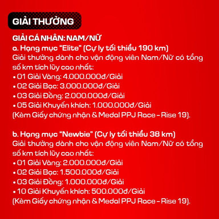 Vì khuôn khổ bài viết có hạn và có quá nhiều sự đổi mới trong mùa giải năm nay nên các VĐV hãy đọc thật kỹ từng điều khoản trong link sau để hiểu thật rõ luật, nắm chắc các quy định mới để tránh những hiểu lầm và sai sót không đáng có nhé, chi tiết tại đây: https://vietrace365.com.vn/…/giai-chay-ppj-race-rise-19…