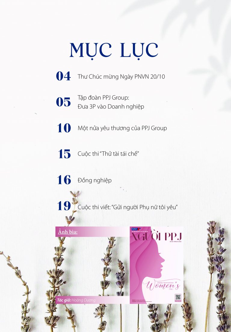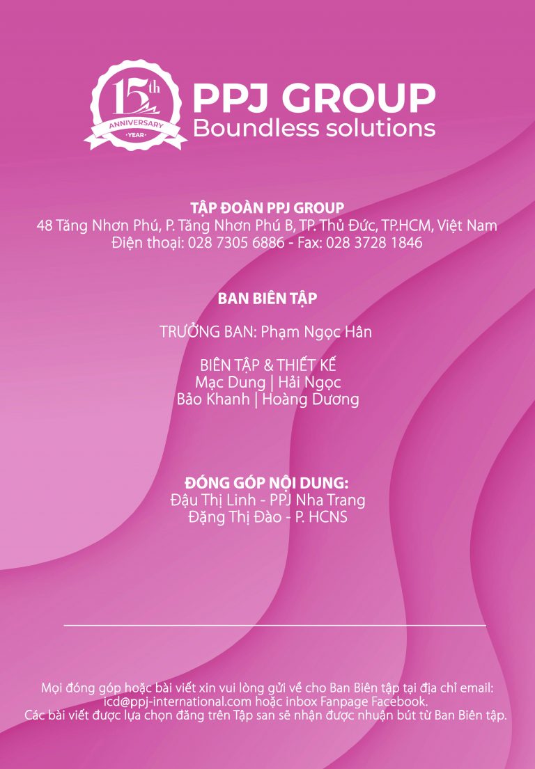 Tháng Mười yêu thương và xinh đẹp, tháng đặc biệt để tri ân những người phụ nữ đa tài và bản lĩnh. Nhân dịp này, Ban biên tập muốn gửi tặng số Tập san Người PPJ số 08- Chuyên đề đặc biệt chào mừng Ngày Phụ nữ Việt Nam 20/10 đến tập thể chị em phụ nữ PPJ thay cho lời tri ân sâu sắc. Cảm ơn sự cống hiến của các chị em suốt quãng thời gian qua và chúc chị em luôn tự tin và rạng rỡ!
