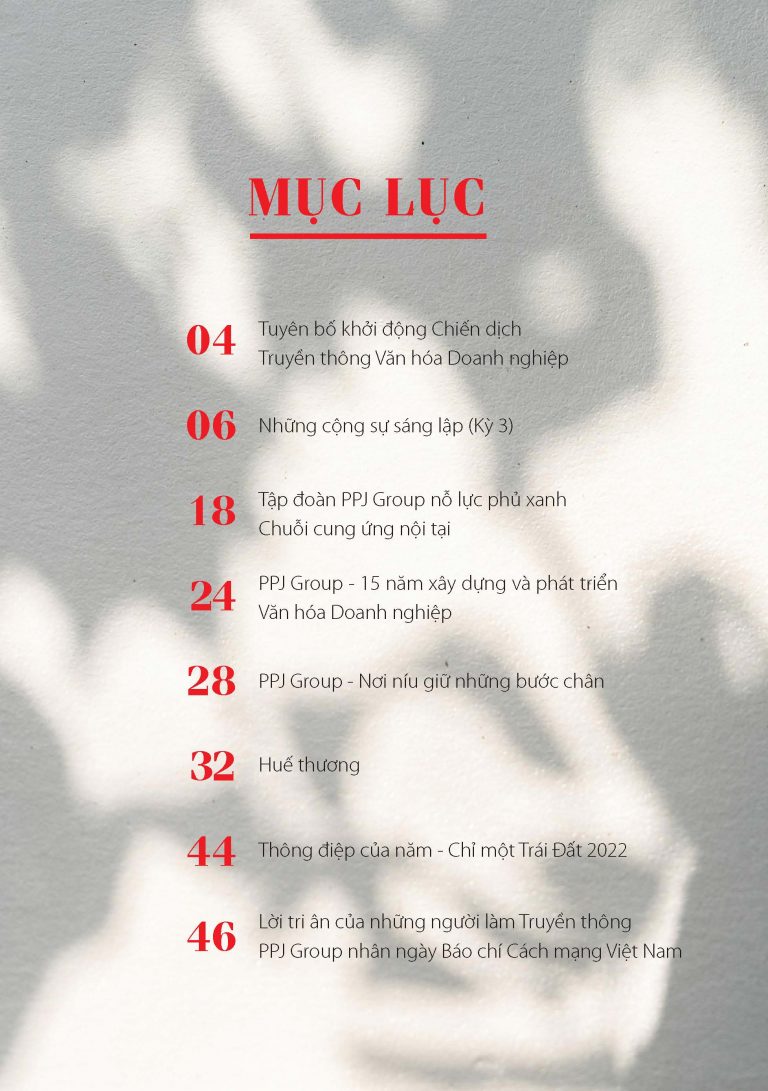 Trong Tập san số tháng này, chúng ta cũng sẽ lắng nghe những tuyên bố đầy cảm hứng của Chủ tịch HĐQT kiêm TGĐ Đặng Vũ Hùng về khởi động chiến dịch truyền thông “văn hóa doanh nghiệp” và tiếp cận với góc nhìn của một cộng tác viên truyền thông nội bộ về vấn đề này. Những câu chuyện về ngày đầu khởi nghiệp của những cộng sự sáng lập Tập đoàn sẽ được tiếp tục với sự chia sẻ của anh Nguyễn Công Trình, anh Nguyễn Văn Phương, anh Nguyễn Quốc Dũng và chị Lê Đình Lan Anh. Chúng ta cũng sẽ được tâm tình cùng hai người phụ nữ rất đặc biệt – một người đã nghỉ việc 2 năm nhưng vẫn quyết định quay trở lại PPJ Group, một người đã nghĩ đến chuyện nghỉ việc 2 lần nhưng vẫn gắn bó với Tập đoàn hơn 2 thập kỉ qua.